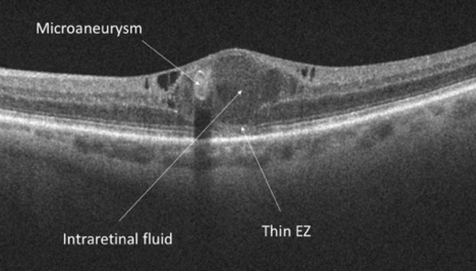 The patient has a microaneurysm and macular edema. They had diabetes.